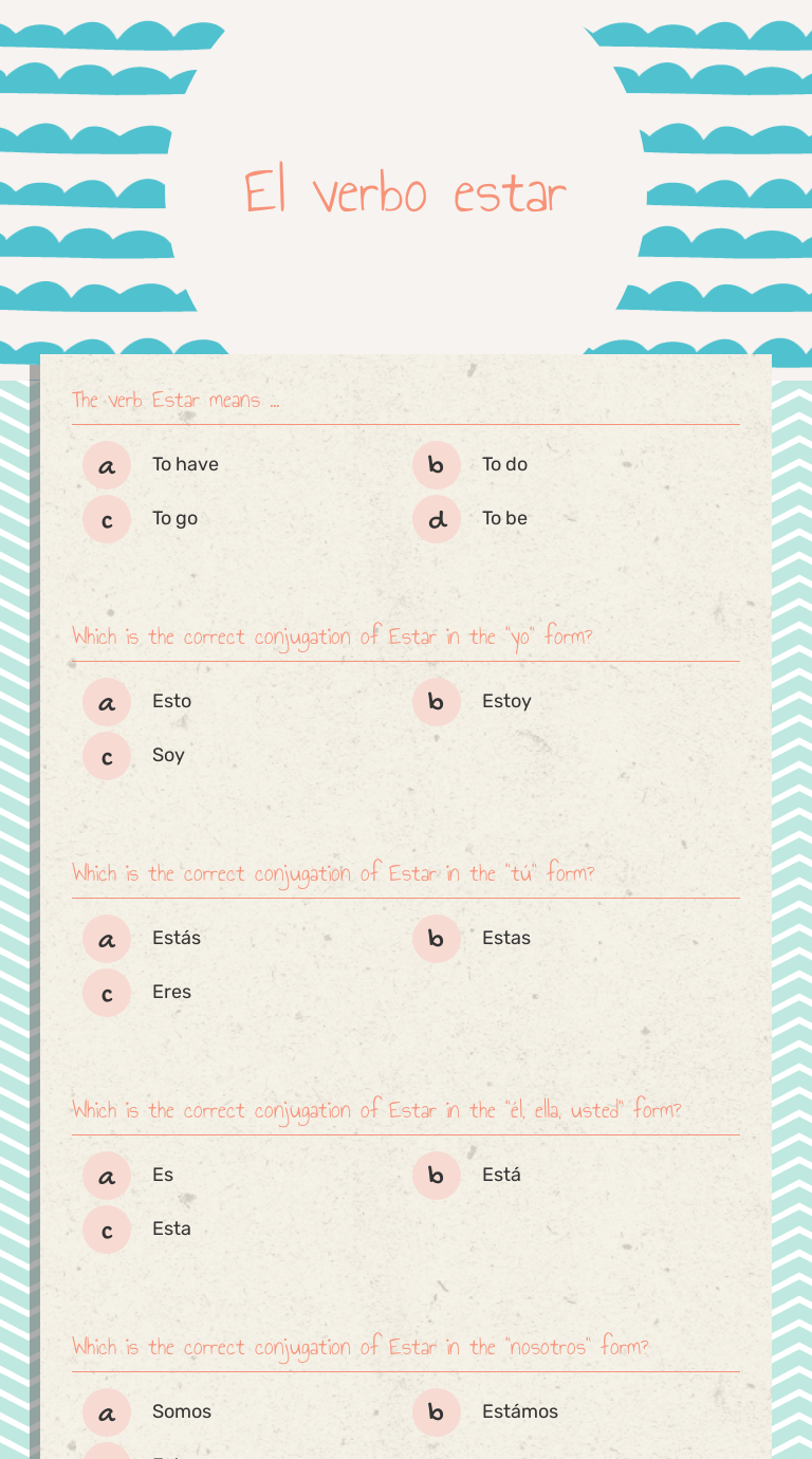 Realidades 3 leveled vocabulary and grammar workbook. El verbo ser spanish4teachers.org (middle school). Start studying el verbo estar. Con esta hoja de trabajo, podrás practicar el verbo estar en español y sus. Die gegenwart mit estar + gerundio verwenden wir, um den ablauf einer handlung.